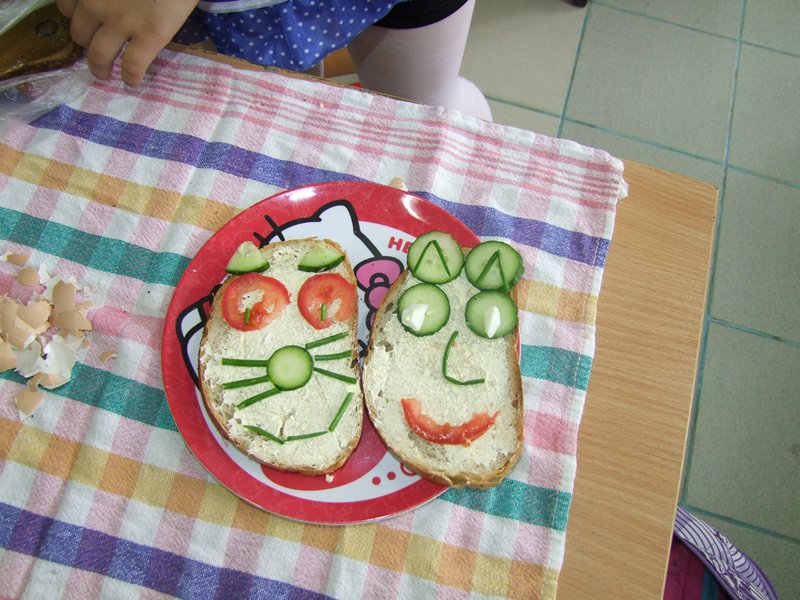 Po wielu emocjach, których dostarczyły nam eksperymenty, przyszedł czas na zrobienie kolacji, dzieci samodzielnie zrobiły sobie przepyszne kanapeczki i posprzątały po sobie.