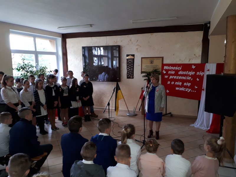 Na zakończenie uroczystości pani dyrektor podziękowała wszystkim osobom zaangażowanym w organizację apelu za piękne występy i cenną lekcję historii, która była także ważnym źródłem informacji o trudnych losach naszej Ojczyzny.